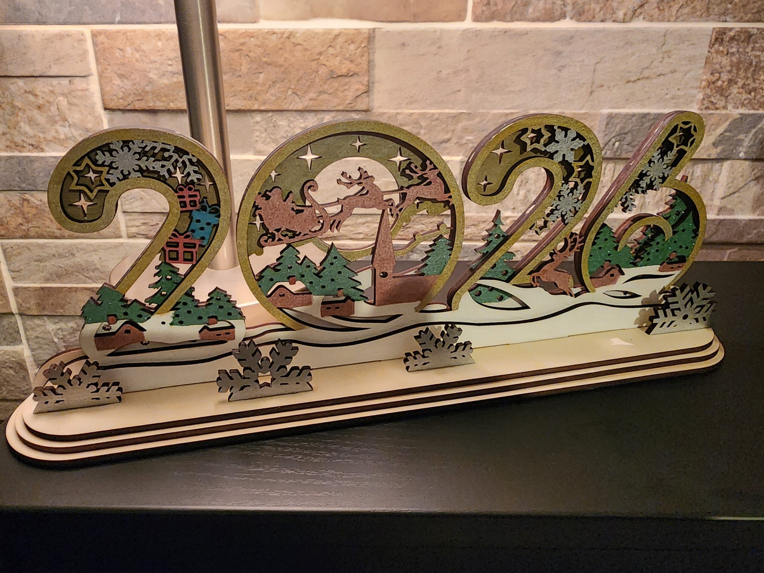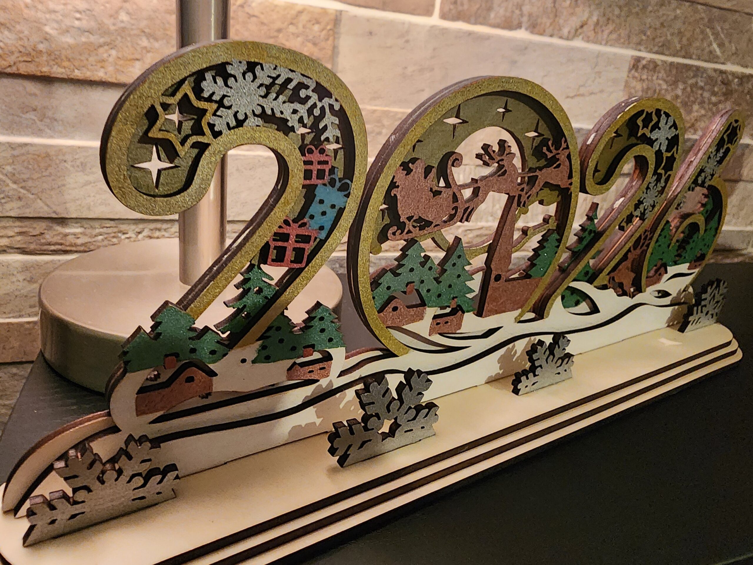 Découpée et peinte à la main, chaque chiffre dévoile une scène magique : le Père Noël dans son traîneau, des sapins enneigés, des chalets illuminés et des rennes galopant sous les étoiles 🌟