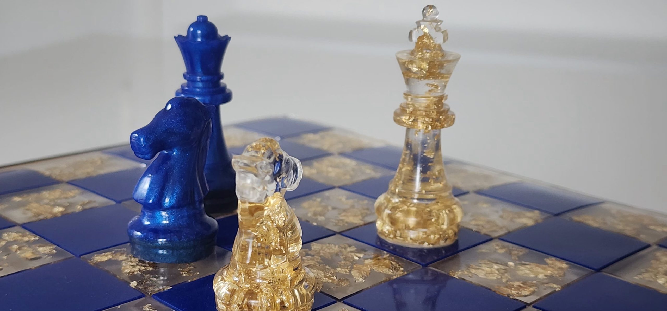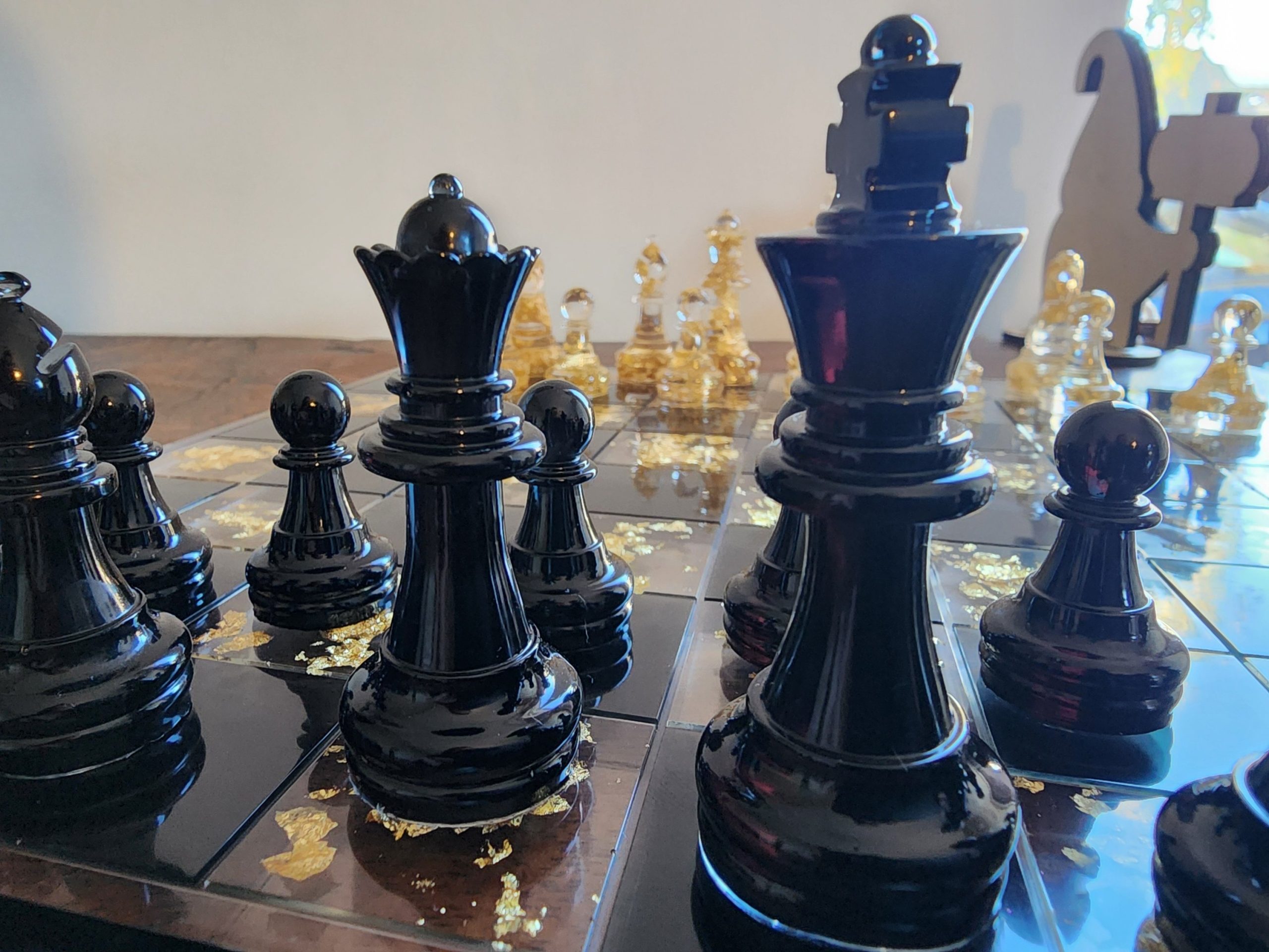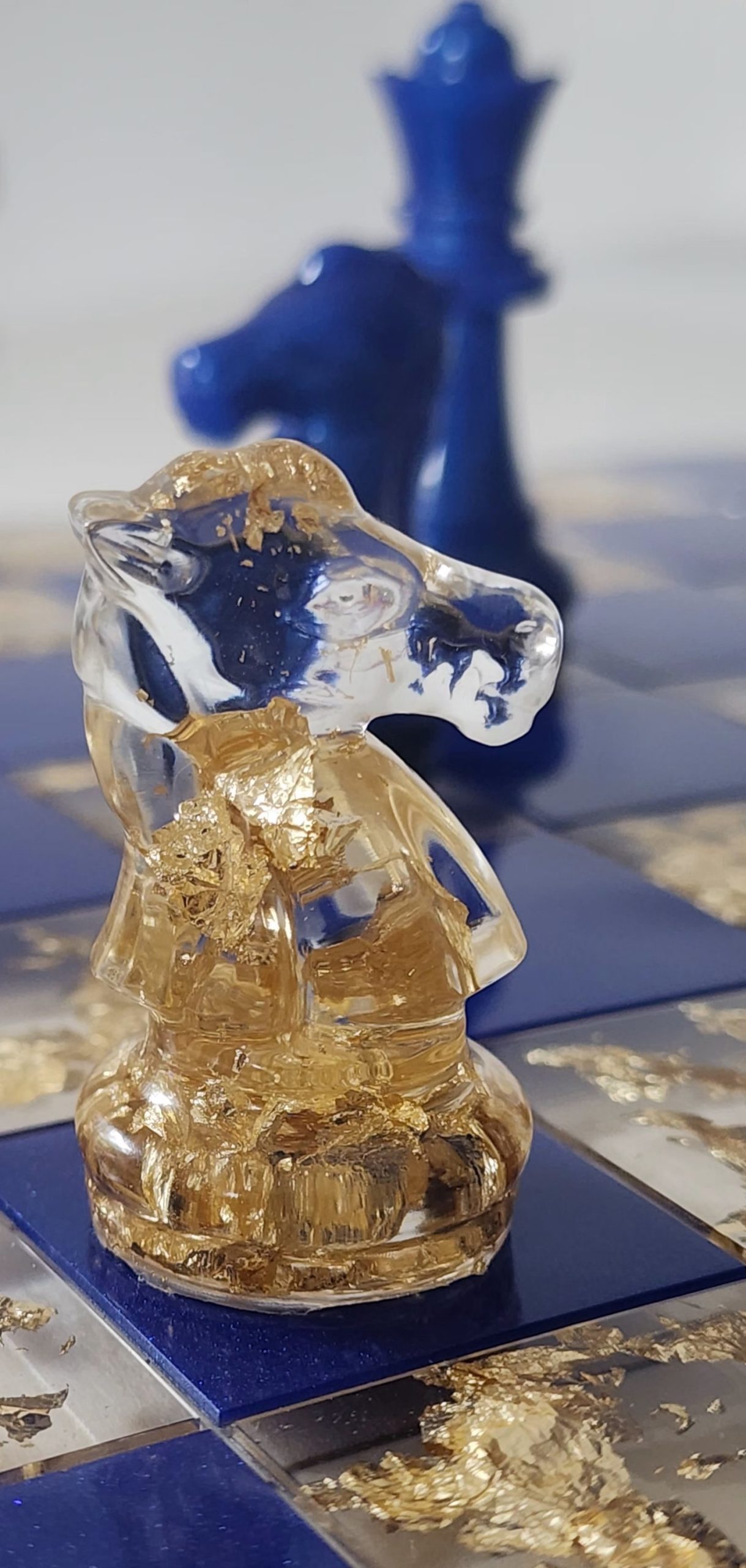 Laisse-toi séduire par cet échiquier en résine entièrement réalisé à la main dans mon atelier. Chaque pièce est coulée une par une, avec soin et précision, pour créer un ensemble raffiné, lumineux et vraiment unique. Les variations de couleurs — résine transparente, noire ou bleu profond — s’associent aux véritables feuilles d’or pour capter la lumière et donner vie à chaque mouvement sur le plateau.