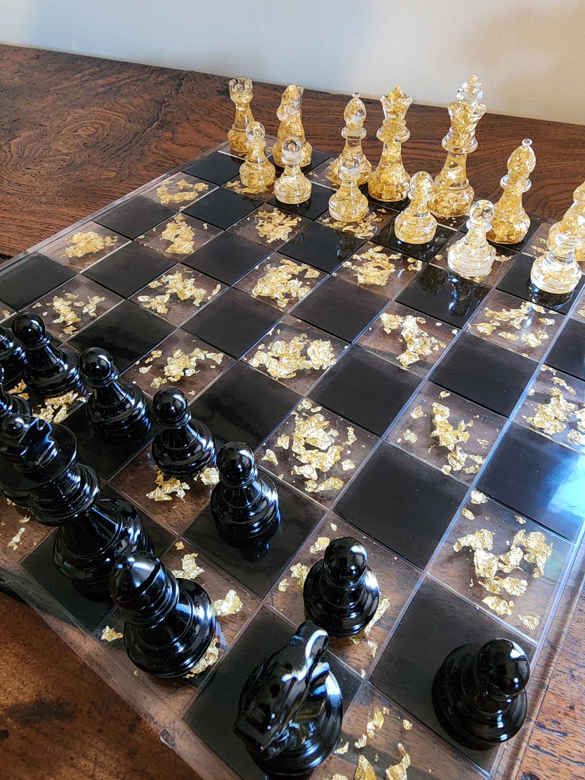 Chaque échiquier en résine est unique : le tien ne ressemblera à aucun autre. Les teintes, les effets de transparence et les inclusions d’or créent toujours une composition différente, comme une véritable pièce d’art artisanale.