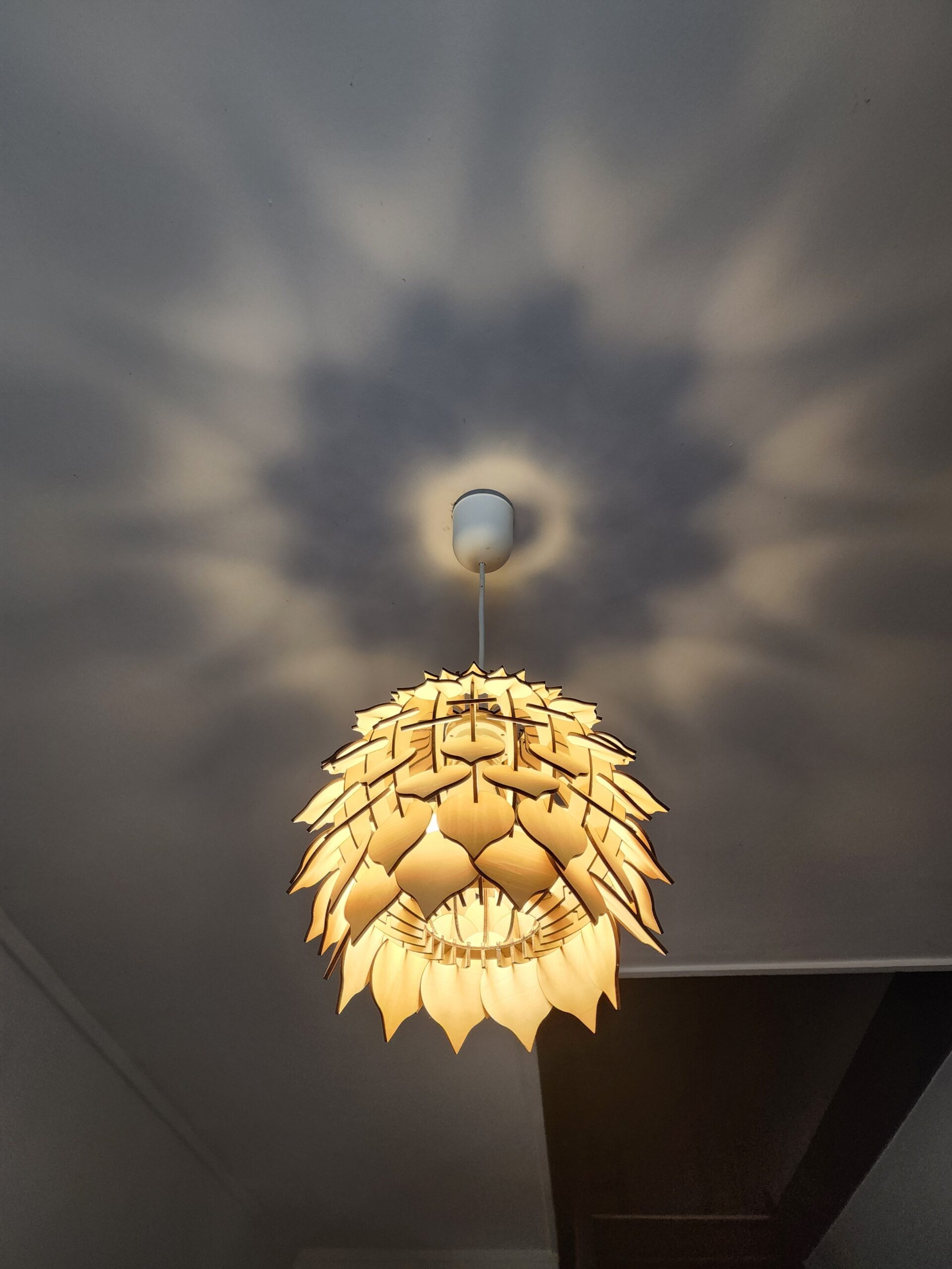 La magie opère dès que vous allumez la lumière. La structure en pétales superposés filtre l’éclairage pour créer une ambiance douce et tamisée, idéale pour un salon ou une chambre.