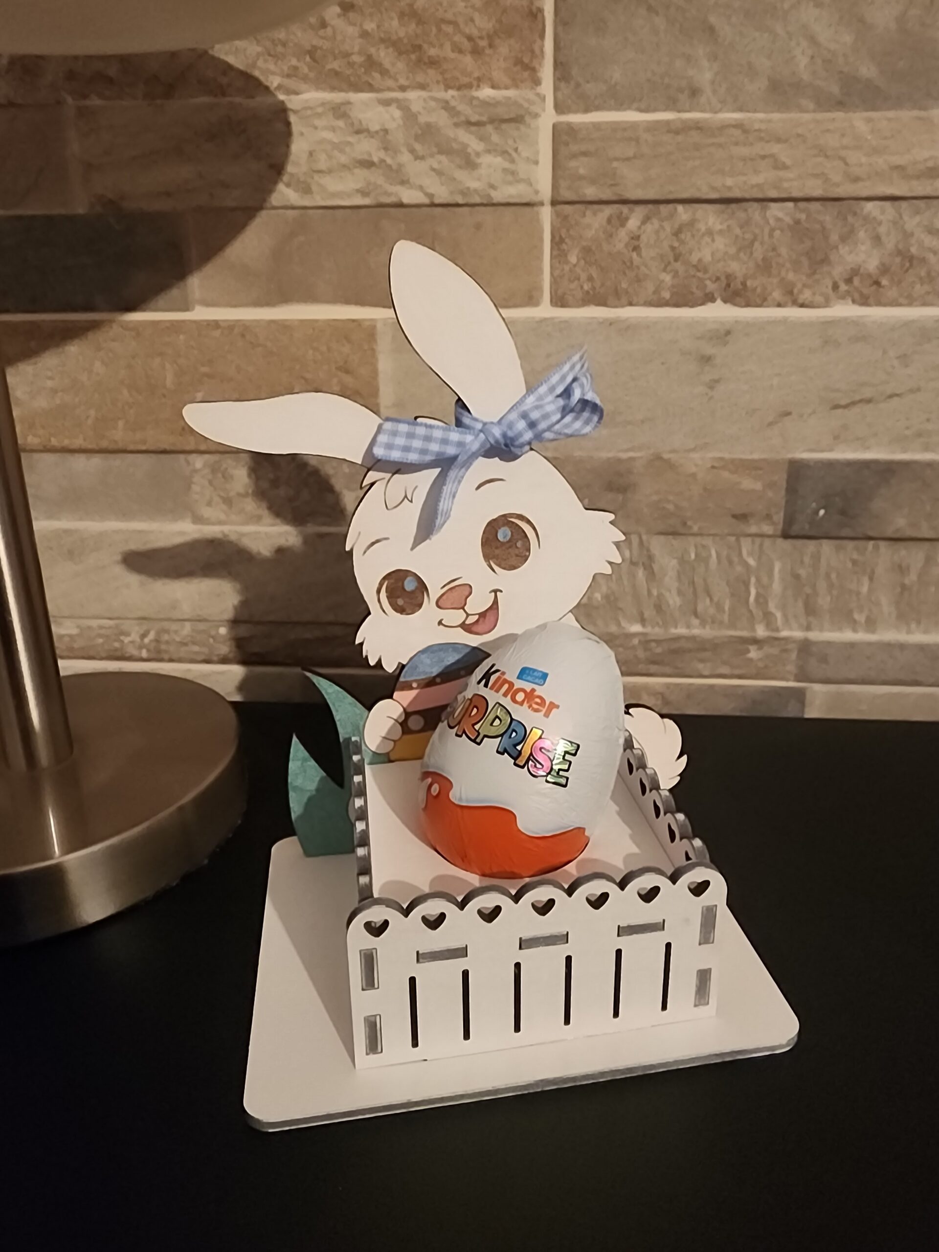 Sublimez la traditionnelle surprise de Pâques avec ce support décoratif artisanal. Conçu pour accueillir parfaitement un œuf en chocolat (type Kinder Surprise), ce petit lapin blanc et sa barrière fleurie transformeront la dégustation en un moment magique.